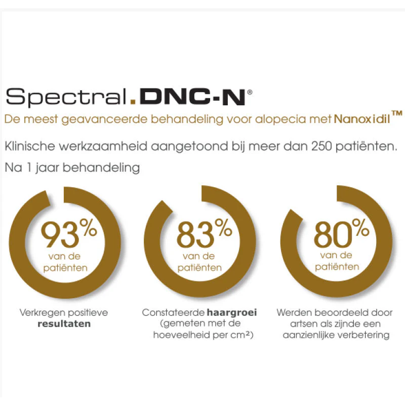 Nanoxidil wordt snel opgenomen door de hoofhuid en werkt zowel op de frontale hoofdlijn als op de kruin. Dit vergroot het effect en daardoor ook de resultaten. Dankzij de nanosomen technologie het een langdurig effect, tot 12 uur. Daarnaast onderdrukt Spectral.DNC-N het DHT (een van de oorzaken van haaruitval). Dit werkt ontstekingsremmend, bevordert de gezondheid van de haarzakjes en stimuleert de haargroei in de anagene fase. Spectral DNC-N is vrij van parabenen, sulfaten, SLS en parfum.