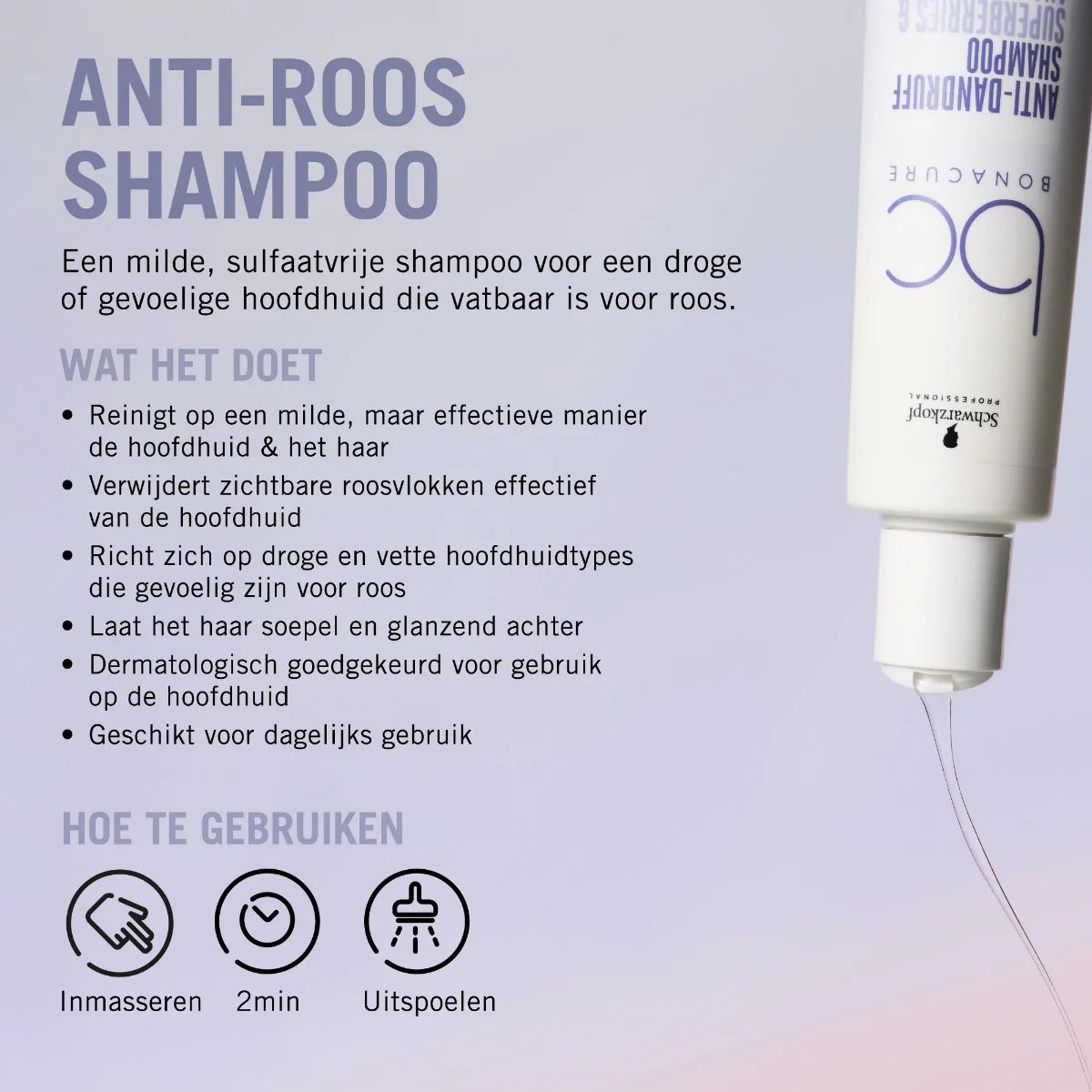 Schwarzkopf Bonacure Scalp Care Anti-Dandruff Shampoo is jouw betrouwbare oplossing voor een roosvrije hoofdhuid. Deze zacht reinigende shampoo is speciaal ontwikkeld om effectief zichtbare roosschilfers te verwijderen en is geschikt voor zowel droge als vette hoofdhuidtypes. De biologisch afbreekbare, pH-neutrale formule met Superfood Complex, waaronder Superbessen en AHA, biedt naast reiniging ook krachtige schimmelwerende eigenschappen. De shampoo brengt je hoofdhuid weer in balans en zorgt voor een gezonde toekomst voor je haar.